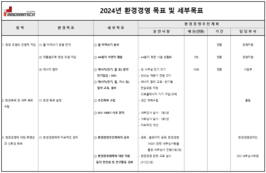 24년 환경경영 목표 및 세부목표 페이지 정보 작성자 이노윈테크 댓글 0건 조회 251회 작성일 24-08-22 10:41 목록 본문 24년 환경경영 목표 및 세부목표 이전글안전보건환경 업무분장 24.08.22 다음글경영방침_품질,환경,안전 24.08.22 댓글 0 댓글목록 등록된 댓글이 없습니다.